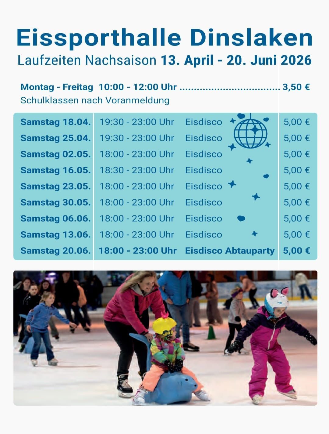 10:00 Ferienlaufzeit für Jedermann 10:00 - 18:00 Uhr € 5,00 Eisdisco ab 15:00 Uhr